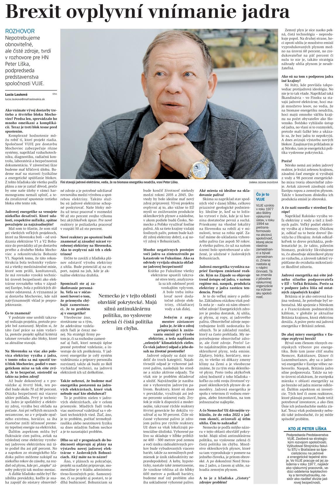 Peter Líška pre Hospodárske noviny o jadre ako čistom zdroji energie, aj o jeho vnímaní po brexite